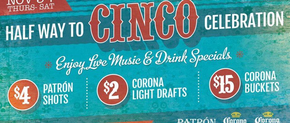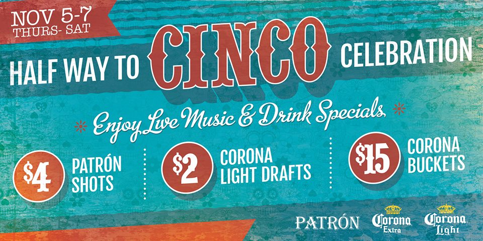 We’re halfway to Cinco de Mayo and that deserves a cheers! Join us now through Saturday for live music and deals on Patron & Corona to celebrate.