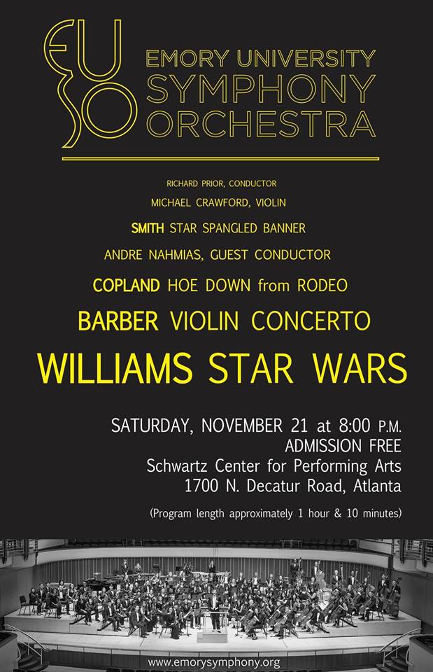 As one of the biggest movie openings in years, the new Star Wars is inspiring everything from marathon screenings to symphony performances. The Emory University Symphony Orchestra is channeling its inner Max Rebo Band for a one night performance of music from Star Wars. Pieces include Yoda’s Theme and The Imperial March.