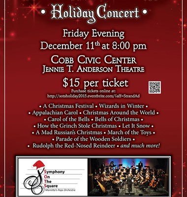 Symphony On The Square Presents: There’s Christmas In the Air Holiday Concert. At 8pm On Friday, December 11th 2015 at the Cobb Civic Center, Jennie T. Anderson Theatre. Come out and enjoy this wonderful concert of Christmas music that is fun for the whole family. You’ll hear favorites like: Rudolph the Red-Nosed Reindeer, How the Grinch Stole Christmas, Parade of the Wooden Soldiers, Let it Snow, Christmas Around the World, and many more. Bring the family and enjoy a concert of fun and beloved Christmas songs and carols. Tickets are $15 and are available Online