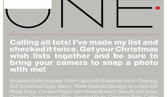 Guests and their parents can enjoy a buffet of breakfast and brunch bites, such as scrambled eggs, cinnamon buns, biscuits and gravy, chicken fingers, waffle-battered sausage on a stick, coffee cake, and more. Santa will also be in the building and ready for photo ops. Reservations are required and can be made for the top of each hour until noon. Free for children under one year old.