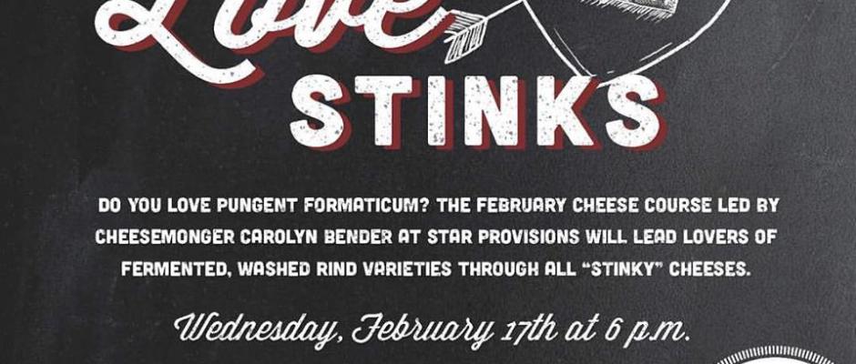 The February cheese course led by cheesemonger Carolyn Bender will lead lovers of fermented, washed rind varieties through all “stinky” cheeses. The class features five pungent cheeses and three wines for. Reservations are required.